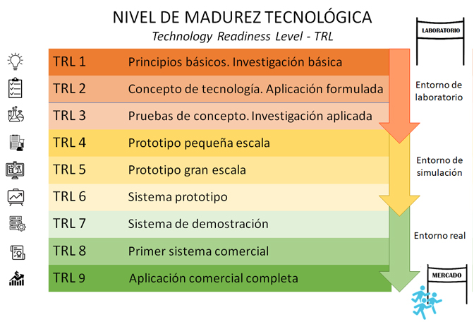 Escala TRL (Technology Readiness Level): mide el grado de madurez de una tecnología. Va del nivel 1 (observación de principios básicos) al nivel 9 (tecnología probada con éxito en un entorno operativo).